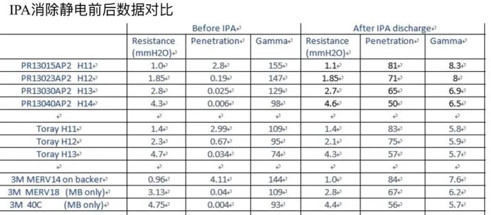 目前我们还是认为新冠病毒经呼吸道飞沫和接触传播是主要的传播途径。控制室内气流分布与流向,空调专业称为气流组织,对于病毒飞沫传播途径有着重要意义。但各种指南却没有提及。由病人通过咳嗽、打喷嚏或说话而产生飞沫,粒径较大,如果送风气流由上而下可以加速飞沫的沉降、缩短传播距离。这里可以借用编制GB 51039-2014《综合医院建筑设计规范》时考虑的控制飞沫传播的二条措施: 一是保证上送下回的气流组织;二是管理好空调系统的回风口。为了增强室内换气量以稀释污染,有些指南要求增设室内空气净化器,本意是好的,但如果空气净化器的送风干扰了通风空调系统的送风气流,扰乱了原来室内设定的气流组织,不利于加速飞沫的沉降和缩短传播距离,况且大多室内空气净化器的末端配置号称是H13的高效过滤器,其实这些过滤器使用的是驻极熔喷滤材,增强了静电效率而阻力很低,以弥补净化器内置风机压头偏低。如根据ISO 16890-4的测试标准,要求空气过滤器在测试前需用IPA (ISO-Propyl-Alcohole)试液对过滤器或过滤单元进行消除静电处理。从下表可以看出H13空气过滤器在消除静电前后其穿透率(Penetration)差异非常大。