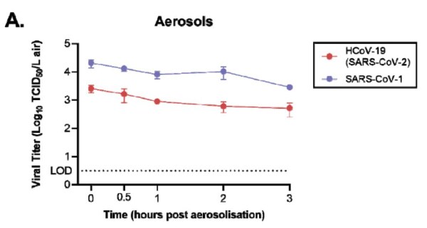 他们发现,活病毒可在雾化后的气溶胶中存活3小时,病毒活性的范围与SARS冠状病毒类似。