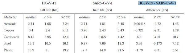 新冠病毒和SARS冠状病毒在气溶胶中表现出相似的半衰期,中位估计值均约为2.7小时,新冠病毒半衰期的95%可信区间为1.65-7.24 小时;SARS病毒则为1.81-5.45小时。