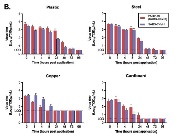 研究者们通过3次反复实验取得的平均值发现,新冠病毒在塑料和不锈钢上最稳定,能够存活最多72小时,尽管3天后病毒的浓度已大大降低。